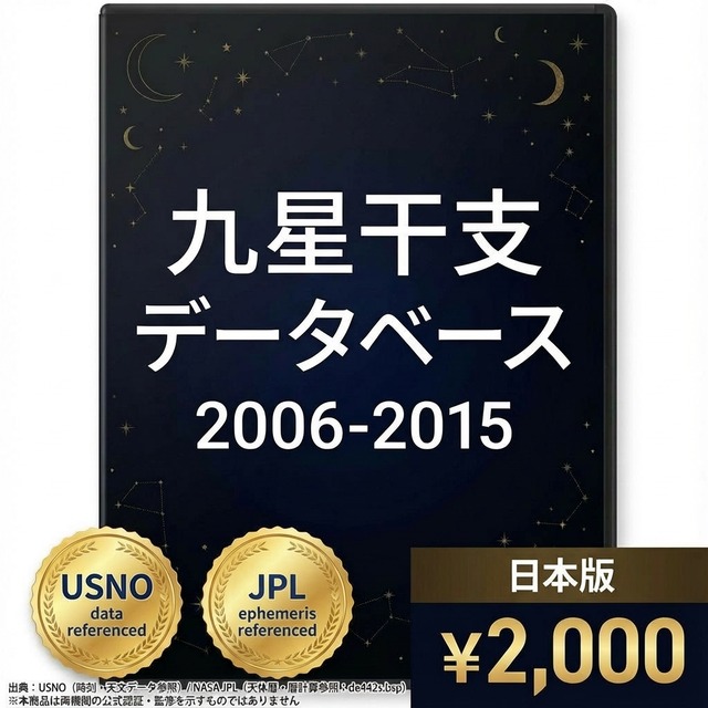 「この人、何年生まれだっけ?本命星はどの九星?」——占い師も研究者も、命式を作るたびに九星・干支を一から調べ直す手間があります。 このデータベースは、その手間をゼロにするために作りました。 ▼ 2006〜2015年(日本版) 2006〜2015年の10年間・毎日の九星と干支を1行1日形式で収録したCSVデータです。平成後期〜令和初期。10〜20代の命式作成にご活用ください。 ▼ こんな方に選ばれています ・九星気学・四柱推命の鑑定を行っている占い師・鑑定士の方 ・命式作成・吉日選定を効率化したいプロの実務家 ・九星や干支に関するアプリ・ツールを開発しているエンジニア ・東洋占術を研究・学習している方 ▼ このデータで変わること 【今まで】万年暦を開いてページを探す → 手入力 → ミスがないか確認 → 数分かかる 【このデータ導入後】日付で検索 → 年家・月家・日家の九星と干支が即座に確認できる → 時刻別の九星まで一覧で取得可能 ▼ 収録内容(CSV形式) ・対象期間:2006〜2015年(約3,650日・1日1行) ・年家九星・年干支(立春基準) ・月家九星・月干支(節入り基準・五虎遁対応) ・日家九星・日干支(変遁日基準) ・時刻別九星(12時間帯×12区分)を1行に収録 ・保存形式:UTF-8(BOM付き)CSVファイル ・Excel・Googleスプレッドシートでそのまま開いてフィルター・検索・集計が可能 ▼ 計算基準について 節気・変遁日の計算は高精度な天文計算に基づいており、カシオ計算サイト準拠の計算基準を採用しています。タイムゾーンは日本標準時(JST・UTC+9)で統一しています。 ▼ 他の期間・都市版について 当店では1866年〜2065年の200年分を10年ごとに分割して販売しています。また東京(日本版)以外に、香港・台湾・中国・シンガポール版(UTC+8)、ロサンゼルス版、ロンドン版、シドニー版、ホノルル版も展開しています。 ▼ 無料サンプルについて ABOUTページよりサンプルデータ(2016年1月分)を無料でダウンロードいただけます。データ構造・列名・文字コードをご確認の上、ご購入ください。 ▼ ご注意 ・本商品はCSVデータです。閲覧にはExcelまたはGoogleスプレッドシートなどの表計算ソフトが必要です。 ・計算基準は一般的に広く用いられるルールに準拠していますが、流派によって異なる場合があります。 ・購入後のキャンセル・返金はデジタルコンテンツの性質上、対応しておりません。