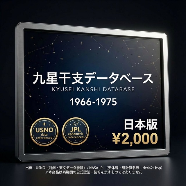「この人、何年生まれだっけ?本命星はどの九星?」——占い師も研究者も、命式を作るたびに九星・干支を一から調べ直す手間があります。 このデータベースは、その手間をゼロにするために作りました。 ▼ 1966〜1975年(日本版) 1966〜1975年の10年間・毎日の九星と干支を1行1日形式で収録したCSVデータです。昭和40〜50年代。現在の50代の方の命式作成に対応します。 ▼ こんな方に選ばれています ・九星気学・四柱推命の鑑定を行っている占い師・鑑定士の方 ・命式作成・吉日選定を効率化したいプロの実務家 ・九星や干支に関するアプリ・ツールを開発しているエンジニア ・東洋占術を研究・学習している方 ▼ このデータで変わること 【今まで】万年暦を開いてページを探す → 手入力 → ミスがないか確認 → 数分かかる 【このデータ導入後】日付で検索 → 年家・月家・日家の九星と干支が即座に確認できる → 時刻別の九星まで一覧で取得可能 ▼ 収録内容(CSV形式) ・対象期間:1966〜1975年(約3,650日・1日1行) ・年家九星・年干支(立春基準) ・月家九星・月干支(節入り基準・五虎遁対応) ・日家九星・日干支(変遁日基準) ・時刻別九星(12時間帯×12区分)を1行に収録 ・保存形式:UTF-8(BOM付き)CSVファイル ・Excel・Googleスプレッドシートでそのまま開いてフィルター・検索・集計が可能 ▼ 計算基準について 節気・変遁日の計算は高精度な天文計算に基づいており、カシオ計算サイト準拠の計算基準を採用しています。タイムゾーンは日本標準時(JST・UTC+9)で統一しています。 ▼ 他の期間・都市版について 当店では1866年〜2065年の200年分を10年ごとに分割して販売しています。また東京(日本版)以外に、香港・台湾・中国・シンガポール版(UTC+8)、ロサンゼルス版、ロンドン版、シドニー版、ホノルル版も展開しています。 ▼ 無料サンプルについて ABOUTページよりサンプルデータ(2016年1月分)を無料でダウンロードいただけます。データ構造・列名・文字コードをご確認の上、ご購入ください。 ▼ ご注意 ・本商品はCSVデータです。閲覧にはExcelまたはGoogleスプレッドシートなどの表計算ソフトが必要です。 ・計算基準は一般的に広く用いられるルールに準拠していますが、流派によって異なる場合があります。 ・購入後のキャンセル・返金はデジタルコンテンツの性質上、対応しておりません。
