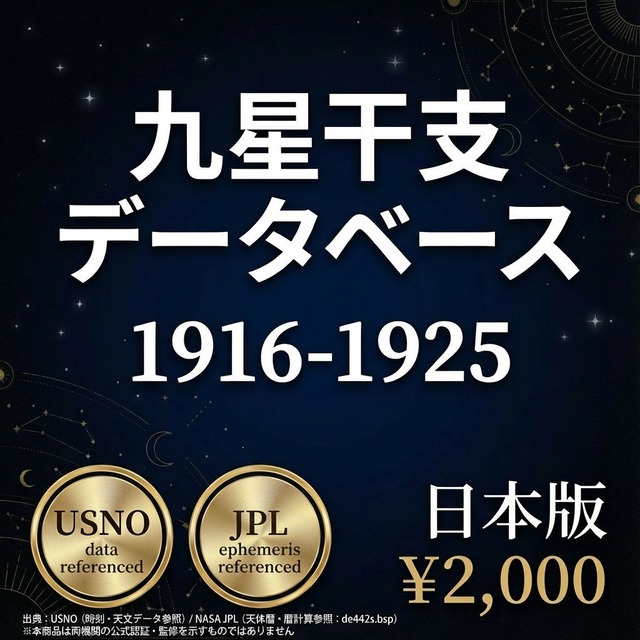「この人、何年生まれだっけ?本命星はどの九星?」——占い師も研究者も、命式を作るたびに九星・干支を一から調べ直す手間があります。 このデータベースは、その手間をゼロにするために作りました。 ▼ 1906〜1915年(日本版) 1906〜1915年の10年間・毎日の九星と干支を1行1日形式で収録したCSVデータです。大正期。歴史上の人物の命式作成や、長期統計研究に対応します。 ▼ こんな方に選ばれています ・九星気学・四柱推命の鑑定を行っている占い師・鑑定士の方 ・命式作成・吉日選定を効率化したいプロの実務家 ・九星や干支に関するアプリ・ツールを開発しているエンジニア ・東洋占術を研究・学習している方 ▼ このデータで変わること 【今まで】万年暦を開いてページを探す → 手入力 → ミスがないか確認 → 数分かかる 【このデータ導入後】日付で検索 → 年家・月家・日家の九星と干支が即座に確認できる → 時刻別の九星まで一覧で取得可能 ▼ 収録内容(CSV形式) ・対象期間:1906〜1915年(約3,650日・1日1行) ・年家九星・年干支(立春基準) ・月家九星・月干支(節入り基準・五虎遁対応) ・日家九星・日干支(変遁日基準) ・時刻別九星(12時間帯×12区分)を1行に収録 ・保存形式:UTF-8(BOM付き)CSVファイル ・Excel・Googleスプレッドシートでそのまま開いてフィルター・検索・集計が可能 ▼ 計算基準について 節気・変遁日の計算は高精度な天文計算に基づいており、カシオ計算サイト準拠の計算基準を採用しています。タイムゾーンは日本標準時(JST・UTC+9)で統一しています。 ▼ 他の期間・都市版について 当店では1866年〜2065年の200年分を10年ごとに分割して販売しています。また東京(日本版)以外に、香港・台湾・中国・シンガポール版(UTC+8)、ロサンゼルス版、ロンドン版、シドニー版、ホノルル版も展開しています。 ▼ 無料サンプルについて ABOUTページよりサンプルデータ(2016年1月分)を無料でダウンロードいただけます。データ構造・列名・文字コードをご確認の上、ご購入ください。 ▼ ご注意 ・本商品はCSVデータです。閲覧にはExcelまたはGoogleスプレッドシートなどの表計算ソフトが必要です。 ・計算基準は一般的に広く用いられるルールに準拠していますが、流派によって異なる場合があります。 ・購入後のキャンセル・返金はデジタルコンテンツの性質上、対応しておりません。