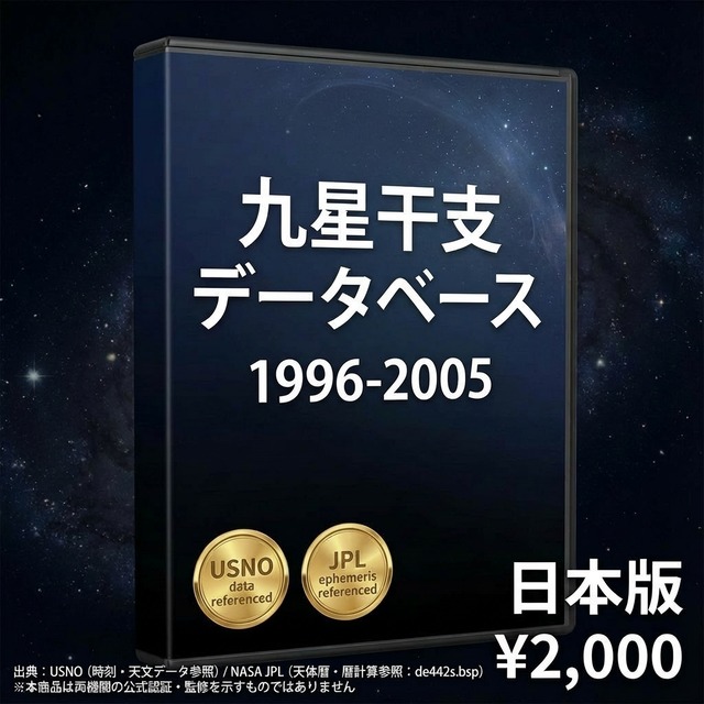 「この人、何年生まれだっけ?本命星はどの九星?」——占い師も研究者も、命式を作るたびに九星・干支を一から調べ直す手間があります。 このデータベースは、その手間をゼロにするために作りました。 ▼ 1996〜2005年(日本版) 1996〜2005年の10年間・毎日の九星と干支を1行1日形式で収録したCSVデータです。平成中期。現在の20代の方の命式作成に対応します。 ▼ こんな方に選ばれています ・九星気学・四柱推命の鑑定を行っている占い師・鑑定士の方 ・命式作成・吉日選定を効率化したいプロの実務家 ・九星や干支に関するアプリ・ツールを開発しているエンジニア ・東洋占術を研究・学習している方 ▼ このデータで変わること 【今まで】万年暦を開いてページを探す → 手入力 → ミスがないか確認 → 数分かかる 【このデータ導入後】日付で検索 → 年家・月家・日家の九星と干支が即座に確認できる → 時刻別の九星まで一覧で取得可能 ▼ 収録内容(CSV形式) ・対象期間:1996〜2005年(約3,650日・1日1行) ・年家九星・年干支(立春基準) ・月家九星・月干支(節入り基準・五虎遁対応) ・日家九星・日干支(変遁日基準) ・時刻別九星(12時間帯×12区分)を1行に収録 ・保存形式:UTF-8(BOM付き)CSVファイル ・Excel・Googleスプレッドシートでそのまま開いてフィルター・検索・集計が可能 ▼ 計算基準について 節気・変遁日の計算は高精度な天文計算に基づいており、カシオ計算サイト準拠の計算基準を採用しています。タイムゾーンは日本標準時(JST・UTC+9)で統一しています。 ▼ 他の期間・都市版について 当店では1866年〜2065年の200年分を10年ごとに分割して販売しています。また東京(日本版)以外に、香港・台湾・中国・シンガポール版(UTC+8)、ロサンゼルス版、ロンドン版、シドニー版、ホノルル版も展開しています。 ▼ 無料サンプルについて ABOUTページよりサンプルデータ(2016年1月分)を無料でダウンロードいただけます。データ構造・列名・文字コードをご確認の上、ご購入ください。 ▼ ご注意 ・本商品はCSVデータです。閲覧にはExcelまたはGoogleスプレッドシートなどの表計算ソフトが必要です。 ・計算基準は一般的に広く用いられるルールに準拠していますが、流派によって異なる場合があります。 ・購入後のキャンセル・返金はデジタルコンテンツの性質上、対応しておりません。