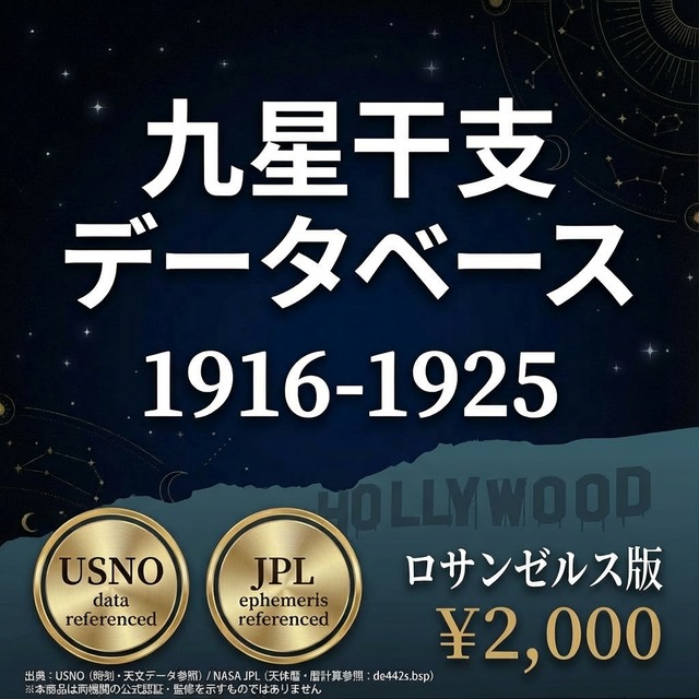 ファイル内容 ・3,651行 × 33列のCSVデータ 1916年1月1日~1925年12月31日の全日付について: ・年家九星・年干支(立春基準) ・月家九星・月干支(12節入り基準、五虎遁対応) ・日家九星・日干支(変遁日基準、陽遁・陰遁対応) ・12時間帯別の九星・干支(Time 1~Time 12) ・陽遁・陰遁フラグ・24節気イベント データの計算基盤 本データは以下の方法で算出されています: 太陽黄経計算方式 24節気判定基準 立春・冬至・夏至の時刻算出方法 変遁日の決定ロジック 陽遁・陰遁の切り替わり判定 日干支の連続計算方式 月家九星の計算公式 ?? 重要な免責事項 計算方法の相違について 本データベースと他の暦本・占術ソフトで数値が異なる場合があります。 これは「どちらが正しい・間違っている」ということではなく、以下の点で計算方法が異なるからです: 異なる可能性がある要素 太陽黄経の計算に使用する天文データ(天体暦モデル) 24節気の「節入り時刻」をどの精度で判定するか 立春・冬至・夏至の時刻判定の基準 変遁日を決定する際の干支インデックスの算出方法 陽遁・陰遁の切り替わり判定ロジック 月家九星の計算に使用する歴法(流派による違い) 日干支の基準日をいつに設定するか タイムゾーン換算の方法 本データベースの立場 本データベースは、特定の計算方法に基づいています。その方法は科学的に妥当ですが、占術においては流派・伝統によって異なるロジックが存在します。 形式と利用 形式:CSV(UTF-8) 対応:Excel、Google スプレッドシート、LibreOffice Calc、プログラミング言語など 注意事項 本ファイルの解釈・活用はご購入者様の責任においてお願いします。ダウンロード製品のため、返品・返金には応じられません。