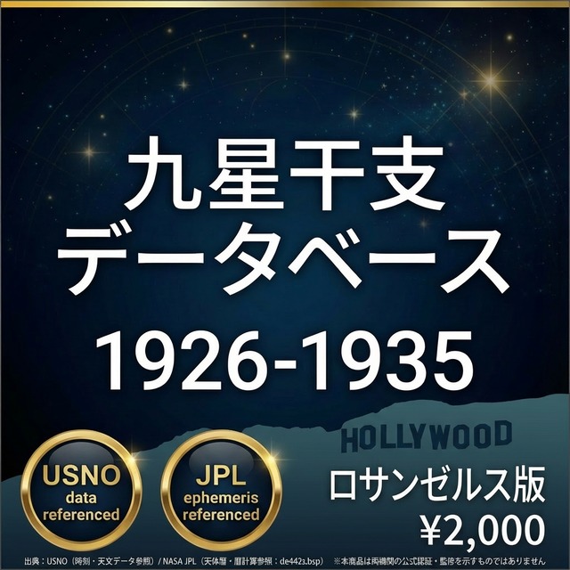ファイル内容 ・3,651行 × 33列のCSVデータ 1926年1月1日~1935年12月31日の全日付について: ・年家九星・年干支(立春基準) ・月家九星・月干支(12節入り基準、五虎遁対応) ・日家九星・日干支(変遁日基準、陽遁・陰遁対応) ・12時間帯別の九星・干支(Time 1~Time 12) ・陽遁・陰遁フラグ・24節気イベント データの計算基盤 本データは以下の方法で算出されています: 太陽黄経計算方式 24節気判定基準 立春・冬至・夏至の時刻算出方法 変遁日の決定ロジック 陽遁・陰遁の切り替わり判定 日干支の連続計算方式 月家九星の計算公式 ?? 重要な免責事項 計算方法の相違について 本データベースと他の暦本・占術ソフトで数値が異なる場合があります。 これは「どちらが正しい・間違っている」ということではなく、以下の点で計算方法が異なるからです: 異なる可能性がある要素 太陽黄経の計算に使用する天文データ(天体暦モデル) 24節気の「節入り時刻」をどの精度で判定するか 立春・冬至・夏至の時刻判定の基準 変遁日を決定する際の干支インデックスの算出方法 陽遁・陰遁の切り替わり判定ロジック 月家九星の計算に使用する歴法(流派による違い) 日干支の基準日をいつに設定するか タイムゾーン換算の方法 本データベースの立場 本データベースは、特定の計算方法に基づいています。その方法は科学的に妥当ですが、占術においては流派・伝統によって異なるロジックが存在します。 形式と利用 形式:CSV(UTF-8) 対応:Excel、Google スプレッドシート、LibreOffice Calc、プログラミング言語など 注意事項 本ファイルの解釈・活用はご購入者様の責任においてお願いします。ダウンロード製品のため、返品・返金には応じられません。