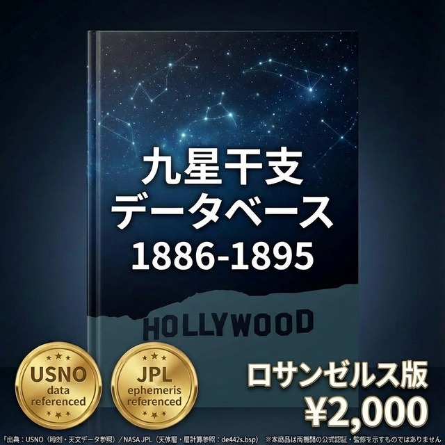 ファイル内容 ・3,651行 × 33列のCSVデータ 1886年1月1日~1895年12月31日の全日付について: ・年家九星・年干支(立春基準) ・月家九星・月干支(12節入り基準、五虎遁対応) ・日家九星・日干支(変遁日基準、陽遁・陰遁対応) ・12時間帯別の九星・干支(Time 1~Time 12) ・陽遁・陰遁フラグ・24節気イベント データの計算基盤 本データは以下の方法で算出されています: 太陽黄経計算方式 24節気判定基準 立春・冬至・夏至の時刻算出方法 変遁日の決定ロジック 陽遁・陰遁の切り替わり判定 日干支の連続計算方式 月家九星の計算公式 ?? 重要な免責事項 計算方法の相違について 本データベースと他の暦本・占術ソフトで数値が異なる場合があります。 これは「どちらが正しい・間違っている」ということではなく、以下の点で計算方法が異なるからです: 異なる可能性がある要素 太陽黄経の計算に使用する天文データ(天体暦モデル) 24節気の「節入り時刻」をどの精度で判定するか 立春・冬至・夏至の時刻判定の基準 変遁日を決定する際の干支インデックスの算出方法 陽遁・陰遁の切り替わり判定ロジック 月家九星の計算に使用する歴法(流派による違い) 日干支の基準日をいつに設定するか タイムゾーン換算の方法 本データベースの立場 本データベースは、特定の計算方法に基づいています。その方法は科学的に妥当ですが、占術においては流派・伝統によって異なるロジックが存在します。 形式と利用 形式:CSV(UTF-8) 対応:Excel、Google スプレッドシート、LibreOffice Calc、プログラミング言語など 注意事項 本ファイルの解釈・活用はご購入者様の責任においてお願いします。ダウンロード製品のため、返品・返金には応じられません。