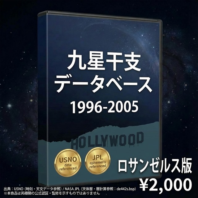 ファイル内容 ・3,651行 × 33列のCSVデータ 1996年1月1日~2005年12月31日の全日付について: ・年家九星・年干支(立春基準) ・月家九星・月干支(12節入り基準、五虎遁対応) ・日家九星・日干支(変遁日基準、陽遁・陰遁対応) ・12時間帯別の九星・干支(Time 1~Time 12) ・陽遁・陰遁フラグ・24節気イベント データの計算基盤 本データは以下の方法で算出されています: 太陽黄経計算方式 24節気判定基準 立春・冬至・夏至の時刻算出方法 変遁日の決定ロジック 陽遁・陰遁の切り替わり判定 日干支の連続計算方式 月家九星の計算公式 ?? 重要な免責事項 計算方法の相違について 本データベースと他の暦本・占術ソフトで数値が異なる場合があります。 これは「どちらが正しい・間違っている」ということではなく、以下の点で計算方法が異なるからです: 異なる可能性がある要素 太陽黄経の計算に使用する天文データ(天体暦モデル) 24節気の「節入り時刻」をどの精度で判定するか 立春・冬至・夏至の時刻判定の基準 変遁日を決定する際の干支インデックスの算出方法 陽遁・陰遁の切り替わり判定ロジック 月家九星の計算に使用する歴法(流派による違い) 日干支の基準日をいつに設定するか タイムゾーン換算の方法 本データベースの立場 本データベースは、特定の計算方法に基づいています。その方法は科学的に妥当ですが、占術においては流派・伝統によって異なるロジックが存在します。 形式と利用 形式:CSV(UTF-8) 対応:Excel、Google スプレッドシート、LibreOffice Calc、プログラミング言語など 注意事項 本ファイルの解釈・活用はご購入者様の責任においてお願いします。ダウンロード製品のため、返品・返金には応じられません。