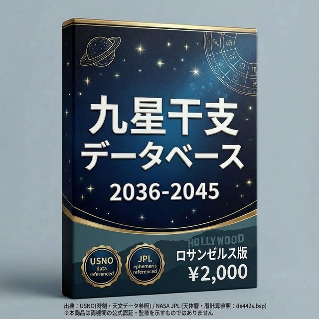 ファイル内容 ・3,651行 × 33列のCSVデータ 2036年1月1日~2045年12月31日の全日付について: ・年家九星・年干支(立春基準) ・月家九星・月干支(12節入り基準、五虎遁対応) ・日家九星・日干支(変遁日基準、陽遁・陰遁対応) ・12時間帯別の九星・干支(Time 1~Time 12) ・陽遁・陰遁フラグ・24節気イベント データの計算基盤 本データは以下の方法で算出されています: 太陽黄経計算方式 24節気判定基準 立春・冬至・夏至の時刻算出方法 変遁日の決定ロジック 陽遁・陰遁の切り替わり判定 日干支の連続計算方式 月家九星の計算公式 ?? 重要な免責事項 計算方法の相違について 本データベースと他の暦本・占術ソフトで数値が異なる場合があります。 これは「どちらが正しい・間違っている」ということではなく、以下の点で計算方法が異なるからです: 異なる可能性がある要素 太陽黄経の計算に使用する天文データ(天体暦モデル) 24節気の「節入り時刻」をどの精度で判定するか 立春・冬至・夏至の時刻判定の基準 変遁日を決定する際の干支インデックスの算出方法 陽遁・陰遁の切り替わり判定ロジック 月家九星の計算に使用する歴法(流派による違い) 日干支の基準日をいつに設定するか タイムゾーン換算の方法 本データベースの立場 本データベースは、特定の計算方法に基づいています。その方法は科学的に妥当ですが、占術においては流派・伝統によって異なるロジックが存在します。 形式と利用 形式:CSV(UTF-8) 対応:Excel、Google スプレッドシート、LibreOffice Calc、プログラミング言語など 注意事項 本ファイルの解釈・活用はご購入者様の責任においてお願いします。ダウンロード製品のため、返品・返金には応じられません。
