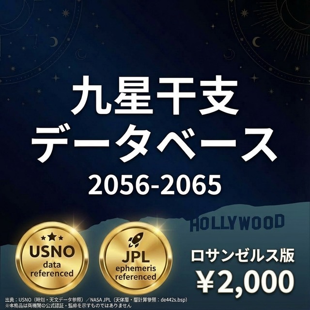 ファイル内容 ・3,651行 × 33列のCSVデータ 2056年1月1日~2065年12月31日の全日付について: ・年家九星・年干支(立春基準) ・月家九星・月干支(12節入り基準、五虎遁対応) ・日家九星・日干支(変遁日基準、陽遁・陰遁対応) ・12時間帯別の九星・干支(Time 1~Time 12) ・陽遁・陰遁フラグ・24節気イベント データの計算基盤 本データは以下の方法で算出されています: 太陽黄経計算方式 24節気判定基準 立春・冬至・夏至の時刻算出方法 変遁日の決定ロジック 陽遁・陰遁の切り替わり判定 日干支の連続計算方式 月家九星の計算公式 ?? 重要な免責事項 計算方法の相違について 本データベースと他の暦本・占術ソフトで数値が異なる場合があります。 これは「どちらが正しい・間違っている」ということではなく、以下の点で計算方法が異なるからです: 異なる可能性がある要素 太陽黄経の計算に使用する天文データ(天体暦モデル) 24節気の「節入り時刻」をどの精度で判定するか 立春・冬至・夏至の時刻判定の基準 変遁日を決定する際の干支インデックスの算出方法 陽遁・陰遁の切り替わり判定ロジック 月家九星の計算に使用する歴法(流派による違い) 日干支の基準日をいつに設定するか タイムゾーン換算の方法 本データベースの立場 本データベースは、特定の計算方法に基づいています。その方法は科学的に妥当ですが、占術においては流派・伝統によって異なるロジックが存在します。 形式と利用 形式:CSV(UTF-8) 対応:Excel、Google スプレッドシート、LibreOffice Calc、プログラミング言語など 注意事項 本ファイルの解釈・活用はご購入者様の責任においてお願いします。ダウンロード製品のため、返品・返金には応じられません。