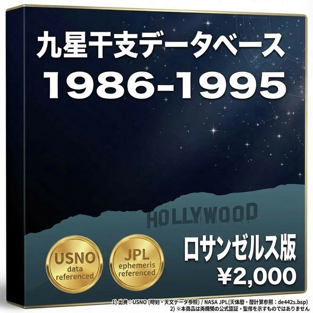 ファイル内容 ・3,651行 × 33列のCSVデータ 1986年1月1日~1995年12月31日の全日付について: ・年家九星・年干支(立春基準) ・月家九星・月干支(12節入り基準、五虎遁対応) ・日家九星・日干支(変遁日基準、陽遁・陰遁対応) ・12時間帯別の九星・干支(Time 1~Time 12) ・陽遁・陰遁フラグ・24節気イベント データの計算基盤 本データは以下の方法で算出されています: 太陽黄経計算方式 24節気判定基準 立春・冬至・夏至の時刻算出方法 変遁日の決定ロジック 陽遁・陰遁の切り替わり判定 日干支の連続計算方式 月家九星の計算公式 ?? 重要な免責事項 計算方法の相違について 本データベースと他の暦本・占術ソフトで数値が異なる場合があります。 これは「どちらが正しい・間違っている」ということではなく、以下の点で計算方法が異なるからです: 異なる可能性がある要素 太陽黄経の計算に使用する天文データ(天体暦モデル) 24節気の「節入り時刻」をどの精度で判定するか 立春・冬至・夏至の時刻判定の基準 変遁日を決定する際の干支インデックスの算出方法 陽遁・陰遁の切り替わり判定ロジック 月家九星の計算に使用する歴法(流派による違い) 日干支の基準日をいつに設定するか タイムゾーン換算の方法 本データベースの立場 本データベースは、特定の計算方法に基づいています。その方法は科学的に妥当ですが、占術においては流派・伝統によって異なるロジックが存在します。 形式と利用 形式:CSV(UTF-8) 対応:Excel、Google スプレッドシート、LibreOffice Calc、プログラミング言語など 注意事項 本ファイルの解釈・活用はご購入者様の責任においてお願いします。ダウンロード製品のため、返品・返金には応じられません。