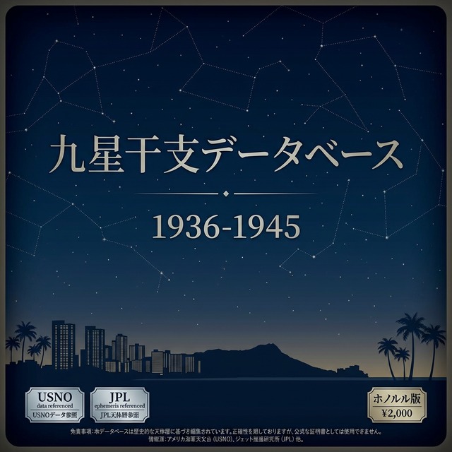 ファイル内容 ・3,651行 × 33列のCSVデータ 1936年1月1日~1945年12月31日の全日付について: ・年家九星・年干支(立春基準) ・月家九星・月干支(12節入り基準、五虎遁対応) ・日家九星・日干支(変遁日基準、陽遁・陰遁対応) ・12時間帯別の九星・干支(Time 1~Time 12) ・陽遁・陰遁フラグ・24節気イベント データの計算基盤 本データは以下の方法で算出されています: 太陽黄経計算方式 24節気判定基準 立春・冬至・夏至の時刻算出方法 変遁日の決定ロジック 陽遁・陰遁の切り替わり判定 日干支の連続計算方式 月家九星の計算公式 ?? 重要な免責事項 計算方法の相違について 本データベースと他の暦本・占術ソフトで数値が異なる場合があります。 これは「どちらが正しい・間違っている」ということではなく、以下の点で計算方法が異なるからです: 異なる可能性がある要素 太陽黄経の計算に使用する天文データ(天体暦モデル) 24節気の「節入り時刻」をどの精度で判定するか 立春・冬至・夏至の時刻判定の基準 変遁日を決定する際の干支インデックスの算出方法 陽遁・陰遁の切り替わり判定ロジック 月家九星の計算に使用する歴法(流派による違い) 日干支の基準日をいつに設定するか タイムゾーン換算の方法 本データベースの立場 本データベースは、特定の計算方法に基づいています。その方法は科学的に妥当ですが、占術においては流派・伝統によって異なるロジックが存在します。 形式と利用 形式:CSV(UTF-8) 対応:Excel、Google スプレッドシート、LibreOffice Calc、プログラミング言語など 注意事項 本ファイルの解釈・活用はご購入者様の責任においてお願いします。ダウンロード製品のため、返品・返金には応じられません。