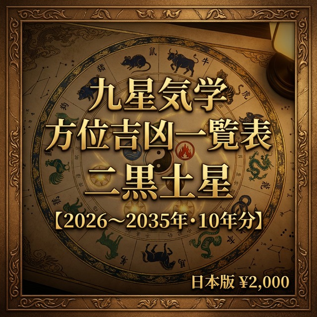 「引越し先の方位、本当にこれで合ってる?」——二黒土星の方は特に、土星ゆえに方位の影響を受けやすいと言われます。だからこそ、毎日の吉凶をきちんと確認したい。 そのための日別データがこのCSVです。 本命星・二黒土星の方専用。2026年〜2035年の10年間・毎日の吉凶方位をExcelで一瞬で調べられるCSVデータです。日付でフィルターをかければ、その日に使える方位がすぐわかります。 ▼ こんな方に選ばれています ・九星気学を使った鑑定を行っている占い師・鑑定士の方 ・吉方旅行・引越し・物件選びに九星気学を活用したい方 ・占術スクールで学んでいる学習者・研究者の方 ・占いアプリや鑑定ツールを開発しているエンジニアの方 ▼ このデータで変わること 【今まで】年盤・月盤・日盤を1つずつ確認 → 凶と重なっていないか手動でチェック → 1日の確認に数分かかる 【このデータ導入後】日付を検索するだけ → 吉凶の判定と根拠が1行で確認できる → 複数日の比較も瞬時 ▼ 収録内容(CSV形式) ・対象期間:2026年1月1日〜2035年12月31日(10年分・約3,650日) ・八方位(北・北東・東・南東・南・南西・西・北西)ごとに毎日の吉凶を収録 ・年盤・月盤・日盤の3盤を個別に管理し、判定根拠を列で追跡可能 ・凶方位の種類を個別に記録:五黄殺・暗剣殺・歳破/月破/日破・本命殺・本命的殺・相剋・水火殺 ・「吉であり、かつ凶と重ならない方位(最終候補)」を自動抽出して表示 ・保存形式:UTF-8(BOM付き)CSVファイル ・Excel・Googleスプレッドシートでそのまま開いてフィルター・検索・集計が可能 ▼ 他のサービスとの違い 無料の吉方位サイトは「今日の吉方位」を表示してくれますが、判定根拠は表示されません。このデータは「なぜその方位が吉なのか・なぜ凶なのか」を列単位で確認できるため、鑑定の説明資料作成や、流派間の差異確認にも対応します。 節気・変遁日の計算は高精度な天文計算に基づいており、カシオ計算サイト準拠の計算基準を採用しています。 ▼ 無料サンプルについて ABOUTページよりサンプルデータ(2016年1月分)を無料でダウンロードいただけます。データ構造・列名・文字コードをご確認の上、ご購入ください。 ▼ ご注意・免責事項 ・本商品はCSVデータです。閲覧にはExcelまたはGoogleスプレッドシートなどの表計算ソフトが必要です。 ・本データは二黒土星(本命星)専用です。他の本命星は別商品をご確認ください。 ・九星気学の吉凶方位の判定基準は流派・解釈によって異なる場合があります。本データの計算結果が、お客様がご利用の流派や鑑定士の見解と一致しないことがあります。 ・本データはデジタルコンテンツであり、購入・ダウンロード後のキャンセル・返金・交換には一切応じられません。動作環境・内容をご確認の上ご購入ください。 ・本データの利用により生じた旅行・引越し・行動の結果について、当店は一切の責任を負いません。最終的な判断はお客様ご自身の責任においてお願いします。 ・本データは日本標準時(JST)に基づいて計算されています。