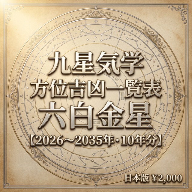 「根拠のない吉方位判定では、自信を持って人に伝えられない」——誠実さと完璧主義の六白金星だからこそ、判定の根拠まで確認してから動きたい。 本命星・六白金星の方専用。2026年〜2035年の10年間・毎日の吉凶方位をExcelで一瞬で調べられるCSVデータです。日付でフィルターをかければ、その日に使える方位がすぐわかります。 ▼ こんな方に選ばれています ・九星気学を使った鑑定を行っている占い師・鑑定士の方 ・吉方旅行・引越し・物件選びに九星気学を活用したい方 ・占術スクールで学んでいる学習者・研究者の方 ・占いアプリや鑑定ツールを開発しているエンジニアの方 ▼ このデータで変わること 【今まで】年盤・月盤・日盤を1つずつ確認 → 凶と重なっていないか手動でチェック → 1日の確認に数分かかる 【このデータ導入後】日付を検索するだけ → 吉凶の判定と根拠が1行で確認できる → 複数日の比較も瞬時 ▼ 収録内容(CSV形式) ・対象期間:2026年1月1日〜2035年12月31日(10年分・約3,650日) ・八方位(北・北東・東・南東・南・南西・西・北西)ごとに毎日の吉凶を収録 ・年盤・月盤・日盤の3盤を個別に管理し、判定根拠を列で追跡可能 ・凶方位の種類を個別に記録:五黄殺・暗剣殺・歳破/月破/日破・本命殺・本命的殺・相剋・水火殺 ・「吉であり、かつ凶と重ならない方位(最終候補)」を自動抽出して表示 ・保存形式:UTF-8(BOM付き)CSVファイル ・Excel・Googleスプレッドシートでそのまま開いてフィルター・検索・集計が可能 ▼ 他のサービスとの違い 無料の吉方位サイトは「今日の吉方位」を表示してくれますが、判定根拠は表示されません。このデータは「なぜその方位が吉なのか・なぜ凶なのか」を列単位で確認できるため、鑑定の説明資料作成や、流派間の差異確認にも対応します。 節気・変遁日の計算は高精度な天文計算に基づいており、カシオ計算サイト準拠の計算基準を採用しています。 ▼ 無料サンプルについて ABOUTページよりサンプルデータ(2016年1月分)を無料でダウンロードいただけます。データ構造・列名・文字コードをご確認の上、ご購入ください。 ▼ ご注意 ・本商品はCSVデータです。閲覧にはExcelまたはGoogleスプレッドシートなどの表計算ソフトが必要です。 ・本データは六白金星(本命星)専用です。他の本命星は別商品をご確認ください。 ・吉凶の最終判断はご自身の運用方針・流派に基づいてご利用ください。 ・購入後のキャンセル・返金はデジタルコンテンツの性質上、対応しておりません。