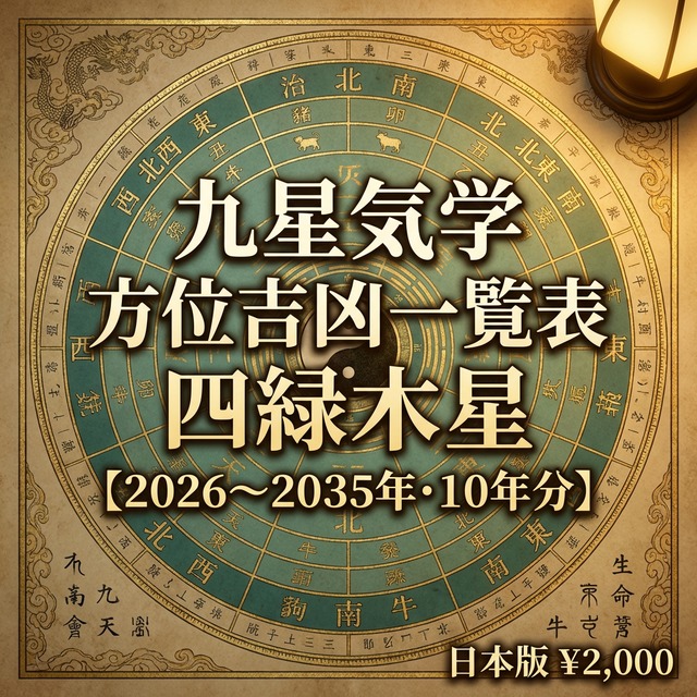 「旅行や出張のたびに、方位が気になって調べる時間が惜しい」——縁とコミュニケーションの四緑木星。動き回るからこそ、方位の確認を素早く終わらせたい。 本命星・四緑木星の方専用。2026年〜2035年の10年間・毎日の吉凶方位をExcelで一瞬で調べられるCSVデータです。日付でフィルターをかければ、その日に使える方位がすぐわかります。 ▼ こんな方に選ばれています ・九星気学を使った鑑定を行っている占い師・鑑定士の方 ・吉方旅行・引越し・物件選びに九星気学を活用したい方 ・占術スクールで学んでいる学習者・研究者の方 ・占いアプリや鑑定ツールを開発しているエンジニアの方 ▼ このデータで変わること 【今まで】年盤・月盤・日盤を1つずつ確認 → 凶と重なっていないか手動でチェック → 1日の確認に数分かかる 【このデータ導入後】日付を検索するだけ → 吉凶の判定と根拠が1行で確認できる → 複数日の比較も瞬時 ▼ 収録内容(CSV形式) ・対象期間:2026年1月1日〜2035年12月31日(10年分・約3,650日) ・八方位(北・北東・東・南東・南・南西・西・北西)ごとに毎日の吉凶を収録 ・年盤・月盤・日盤の3盤を個別に管理し、判定根拠を列で追跡可能 ・凶方位の種類を個別に記録:五黄殺・暗剣殺・歳破/月破/日破・本命殺・本命的殺・相剋・水火殺 ・「吉であり、かつ凶と重ならない方位(最終候補)」を自動抽出して表示 ・保存形式:UTF-8(BOM付き)CSVファイル ・Excel・Googleスプレッドシートでそのまま開いてフィルター・検索・集計が可能 ▼ 他のサービスとの違い 無料の吉方位サイトは「今日の吉方位」を表示してくれますが、判定根拠は表示されません。このデータは「なぜその方位が吉なのか・なぜ凶なのか」を列単位で確認できるため、鑑定の説明資料作成や、流派間の差異確認にも対応します。 節気・変遁日の計算は高精度な天文計算に基づいており、カシオ計算サイト準拠の計算基準を採用しています。 ▼ 無料サンプルについて ABOUTページよりサンプルデータ(2016年1月分)を無料でダウンロードいただけます。データ構造・列名・文字コードをご確認の上、ご購入ください。 ▼ ご注意・免責事項 ・本商品はCSVデータです。閲覧にはExcelまたはGoogleスプレッドシートなどの表計算ソフトが必要です。 ・本データは四緑木星(本命星)専用です。他の本命星は別商品をご確認ください。 ・九星気学の吉凶方位の判定基準は流派・解釈によって異なる場合があります。本データの計算結果が、お客様がご利用の流派や鑑定士の見解と一致しないことがあります。 ・本データはデジタルコンテンツであり、購入・ダウンロード後のキャンセル・返金・交換には一切応じられません。動作環境・内容をご確認の上ご購入ください。 ・本データの利用により生じた旅行・引越し・行動の結果について、当店は一切の責任を負いません。最終的な判断はお客様ご自身の責任においてお願いします。 ・本データは日本標準時(JST)に基づいて計算されています。