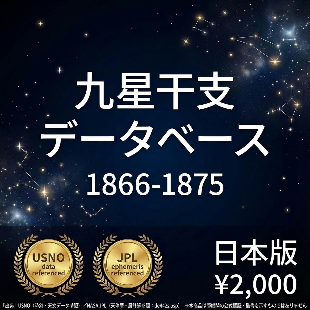 1866〜1875年の10年間・毎日の九星と干支を1行1日形式で収録したCSVデータです。明治維新前後の歴史研究・歴史上の人物の命式作成にも活用できます。