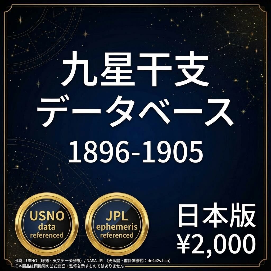 1896〜1905年の10年間・毎日の九星と干支を1行1日形式で収録したCSVデータです。明治末〜大正初期。歴史研究・命式データベース構築にご活用ください。