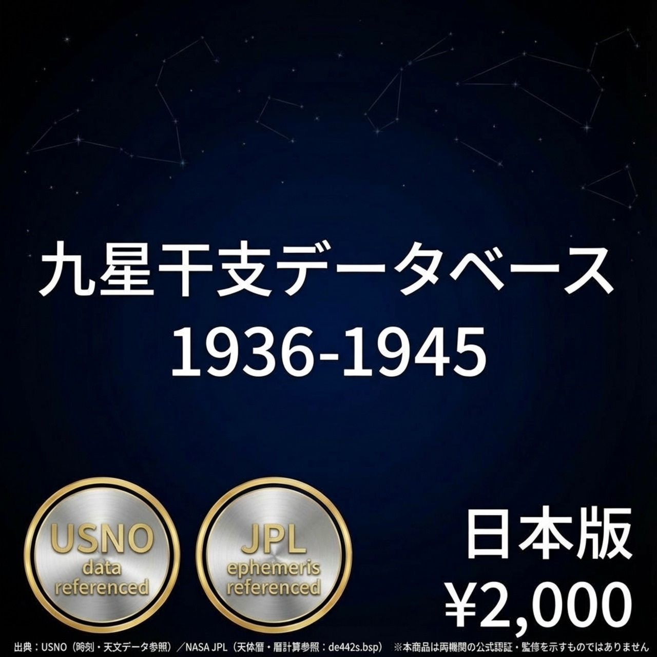 1936〜1945年の10年間・毎日の九星と干支を1行1日形式で収録したCSVデータです。昭和中期・戦中戦後。80代以上の方の命式作成に対応します。