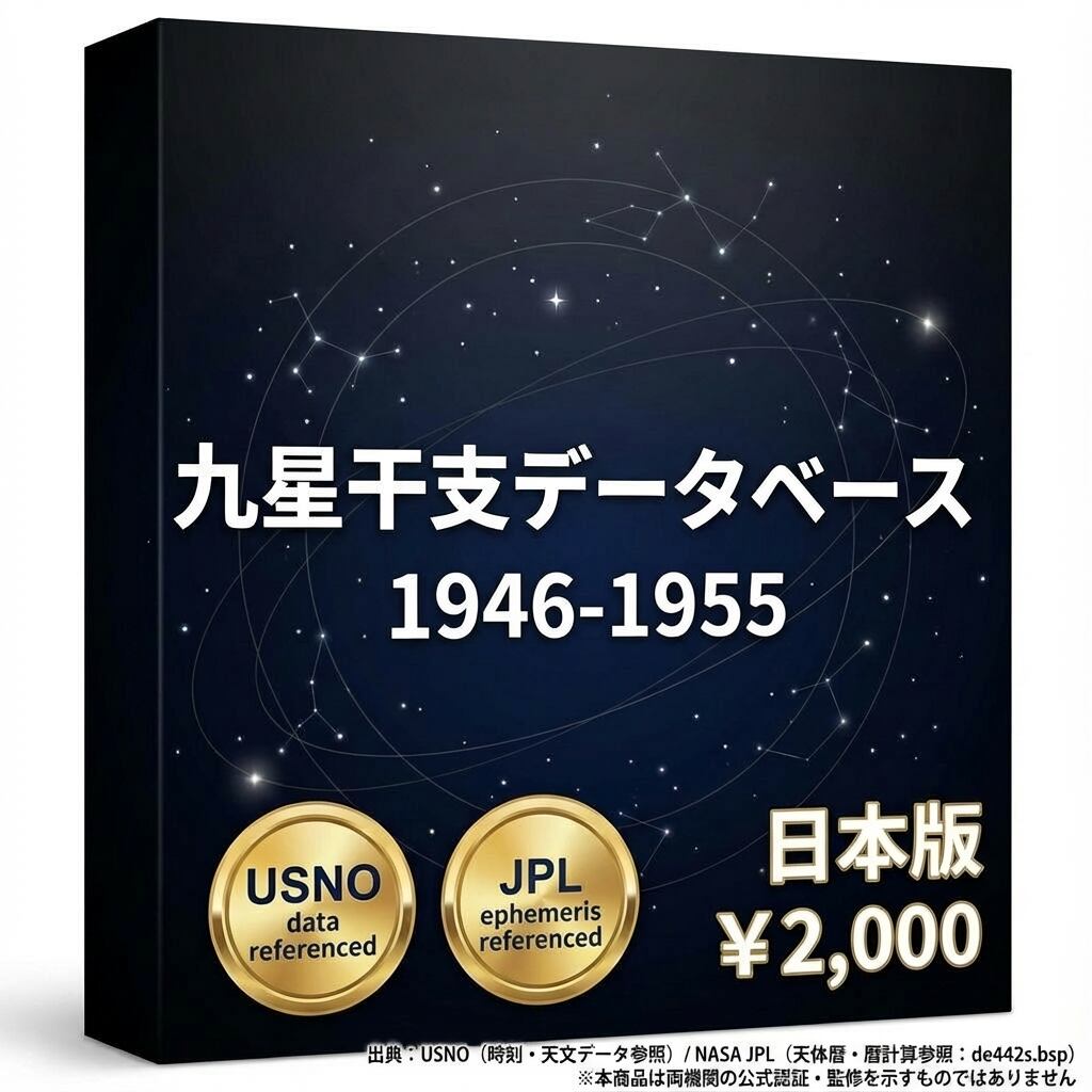 1946〜1955年の10年間・毎日の九星と干支を1行1日形式で収録したCSVデータです。昭和20〜30年代。団塊世代の命式作成に最もよく使われる年代です。