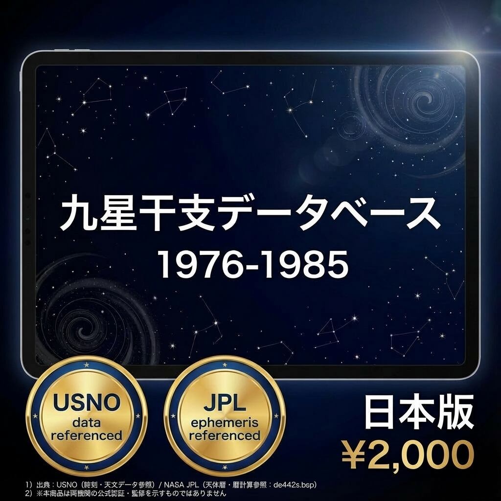 1976〜1985年の10年間・毎日の九星と干支を1行1日形式で収録したCSVデータです。昭和50〜60年代。現在の40代の方の命式作成に対応します。