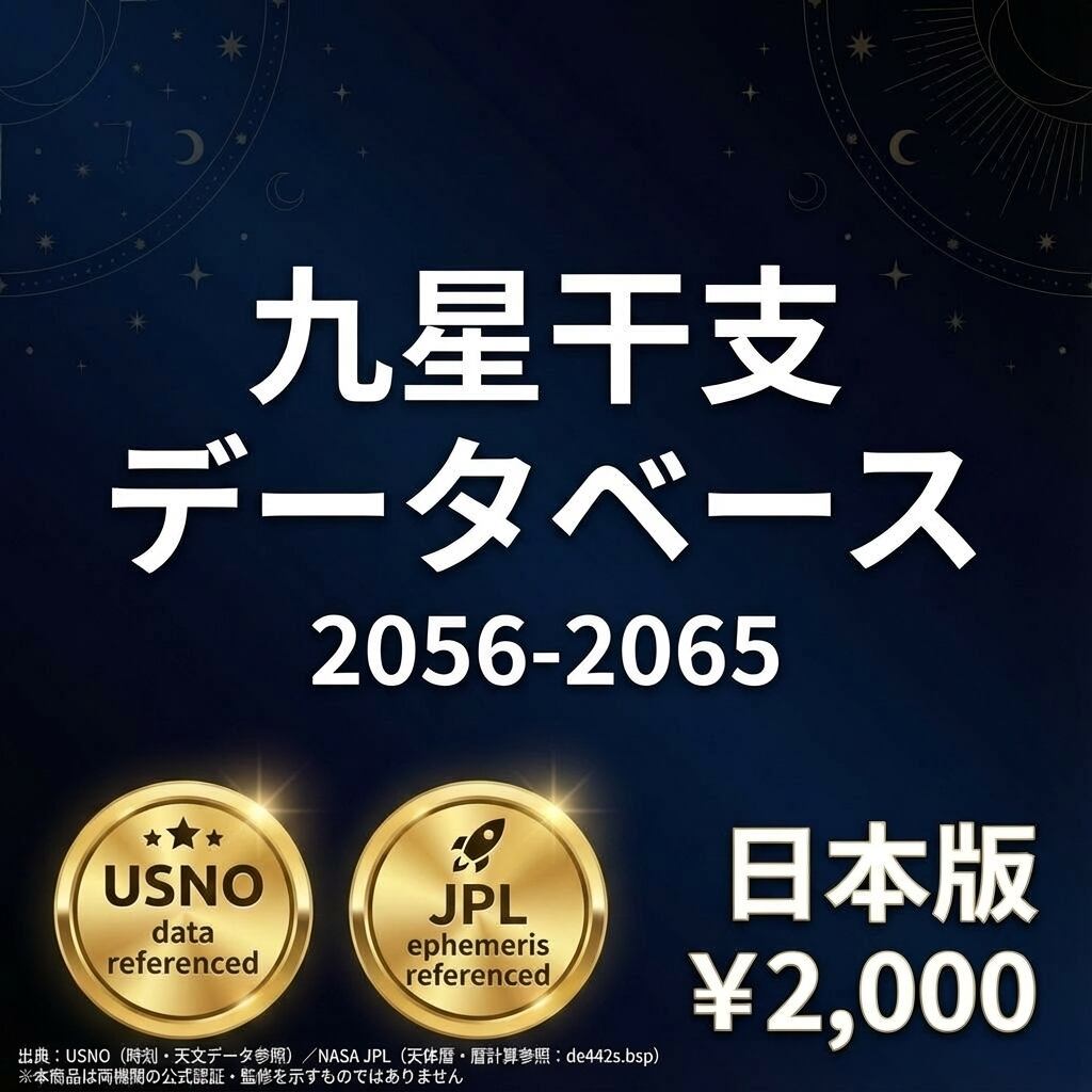 2056〜2065年の10年間・毎日の九星と干支を1行1日形式で収録したCSVデータです。200年シリーズの最終巻。全期間を揃えたい研究者・開発者向けです。