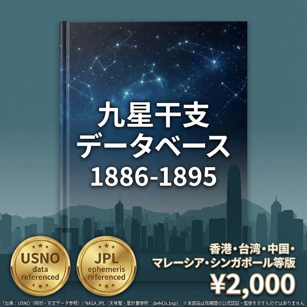 九星干支の切り替わりは「日付」ではなく「時刻」で変わります。東京(UTC+9)と香港(UTC+8)では1時間の時差があり、節入り当日・変遁日前後の境界付近では判定が異なる場合があります。本データは現地時刻で計算したマスターデータです。