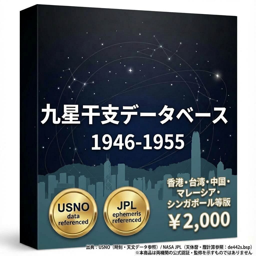 1946〜1955年の10年間・毎日の九星と干支を1行1日形式で収録したCSVデータです。昭和20〜30年代。東アジア出身の団塊世代の命式作成に対応します。
