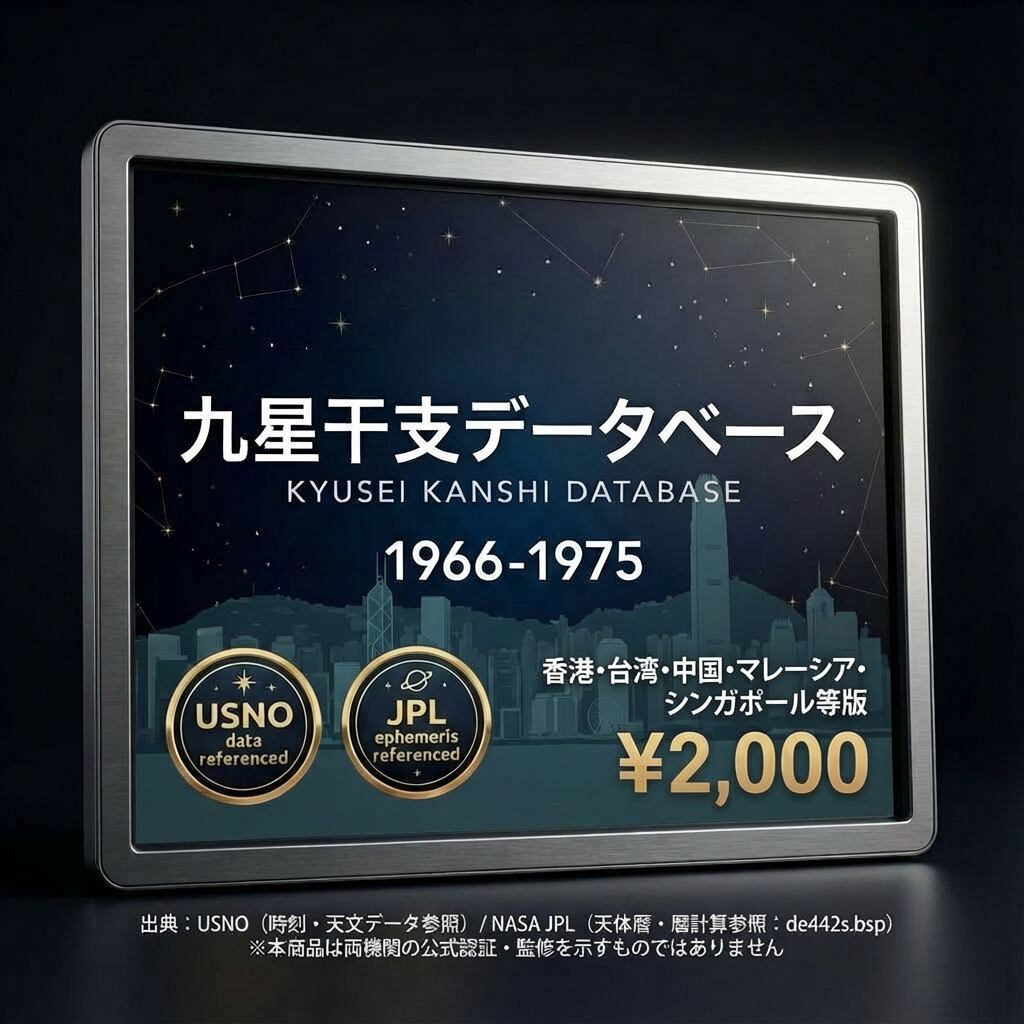 九星干支の切り替わりは「日付」ではなく「時刻」で変わります。東京(UTC+9)と香港(UTC+8)では1時間の時差があり、節入り当日・変遁日前後の境界付近では判定が異なる場合があります。本データは現地時刻で計算したマスターデータです。