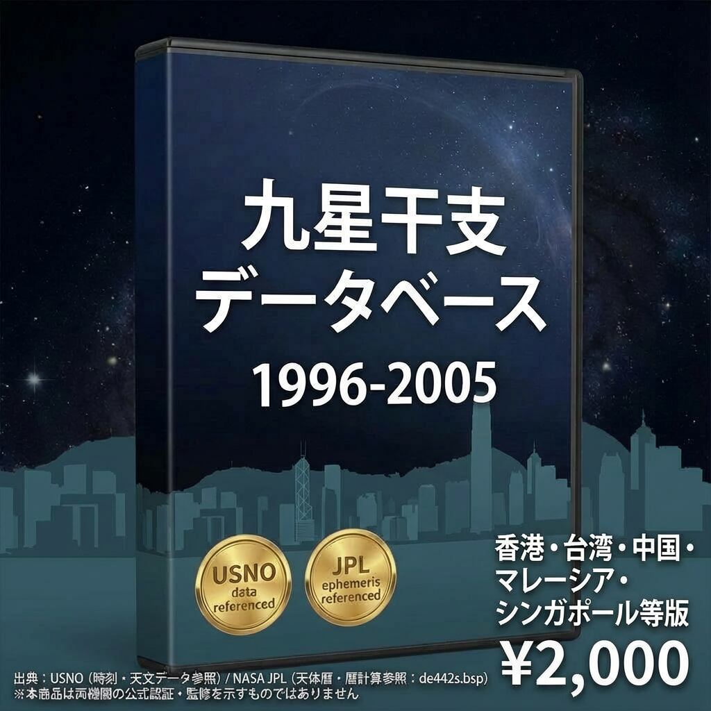 九星干支の切り替わりは「日付」ではなく「時刻」で変わります。東京(UTC+9)と香港(UTC+8)では1時間の時差があり、節入り当日・変遁日前後の境界付近では判定が異なる場合があります。本データは現地時刻で計算したマスターデータです。