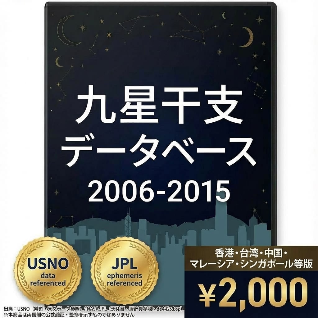 九星干支の切り替わりは「日付」ではなく「時刻」で変わります。東京(UTC+9)と香港(UTC+8)では1時間の時差があり、節入り当日・変遁日前後の境界付近では判定が異なる場合があります。本データは現地時刻で計算したマスターデータです。