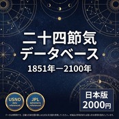 二十四節気を「太陽黄経15度刻み」という天文学的定義に基づき、天体暦を用いた計算で“節気が切り替わる瞬間の時刻”まで整理したデータベースです。暦注・命式作成・節入り判定・吉日検討など、秒~分単位の境界が効く用途で威力を発揮します。