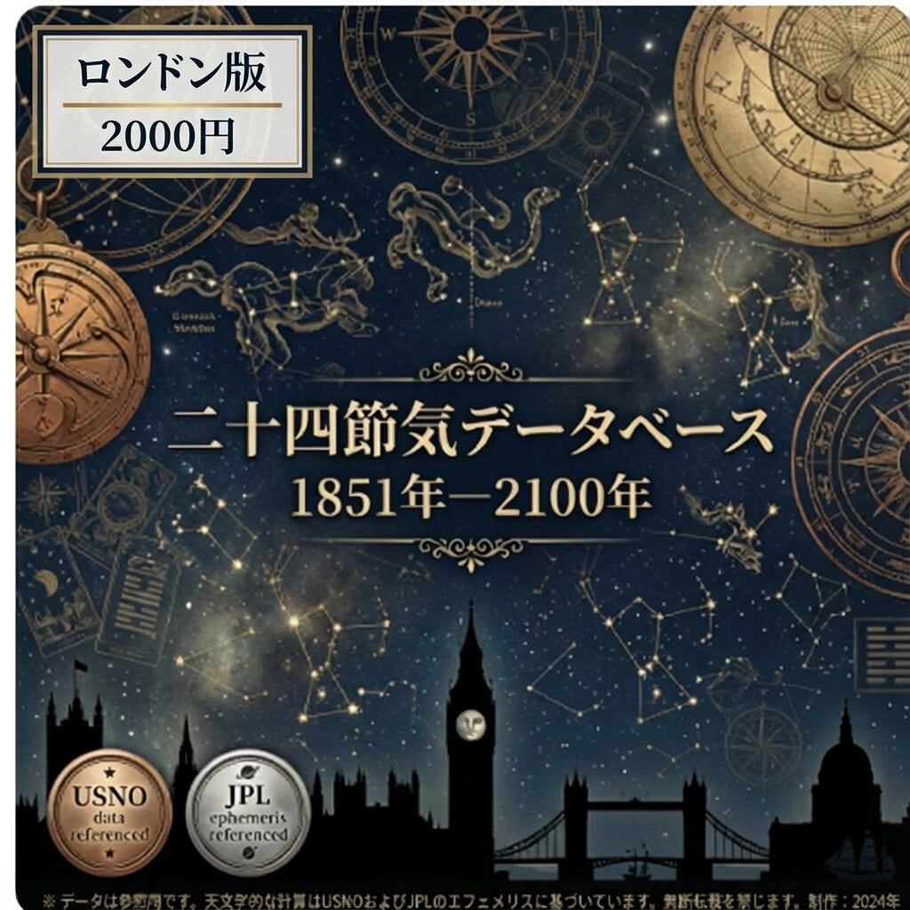 本商品は、こうした“時刻制度の揺れ”を前提に、ロンドン(Europe/London)の現地時刻で二十四節気を扱えるように整備したデータベースです。